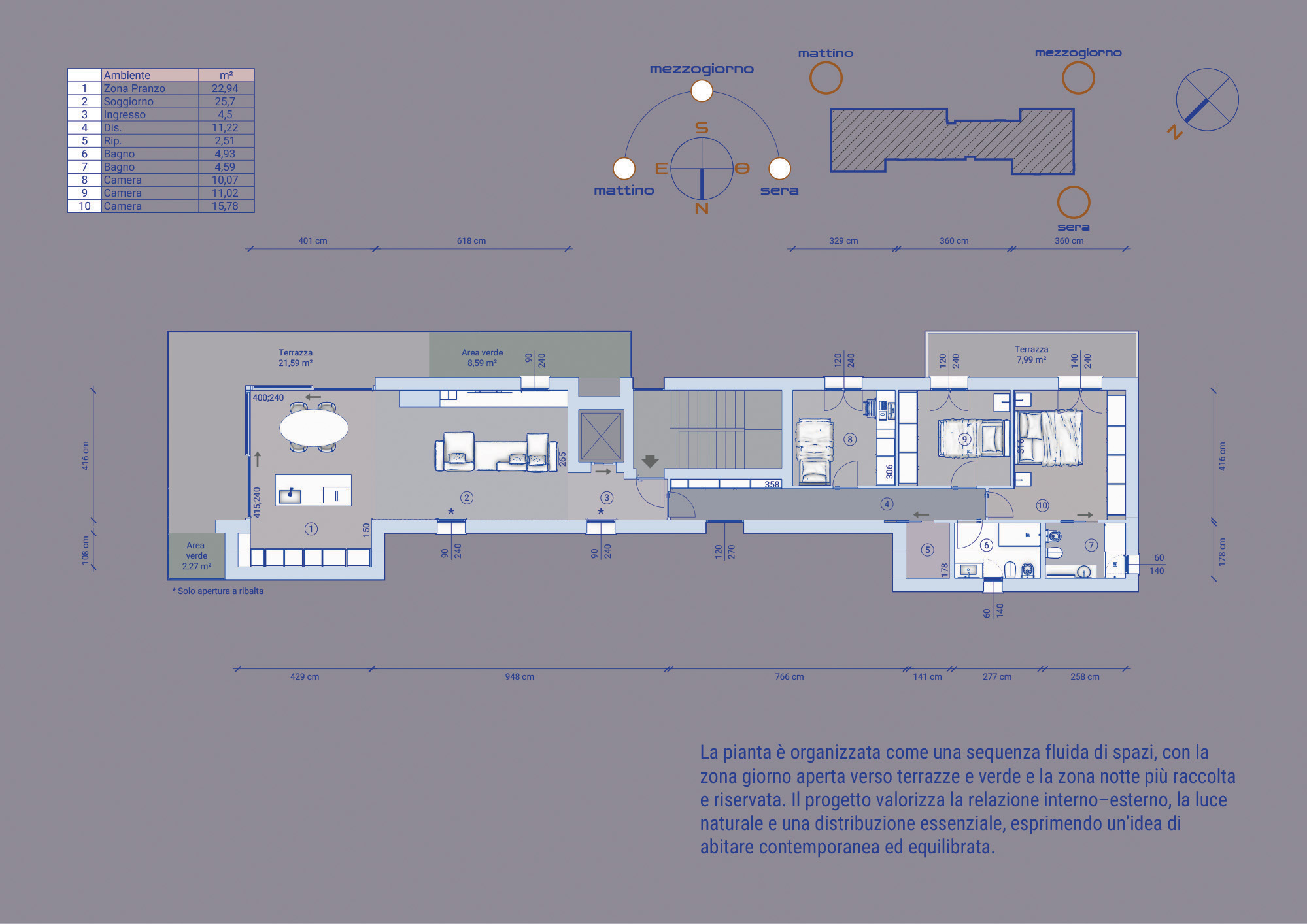 La pianta è organizzata come una sequenza fluida di spazi, con la zona giorno aperta verso terrazze e verde e la zona notte più raccolta e riservata. Il progetto valorizza la relazione interno–esterno, la luce naturale e una distribuzione essenziale, esprimendo un’idea di abitare contemporanea ed equilibrata.