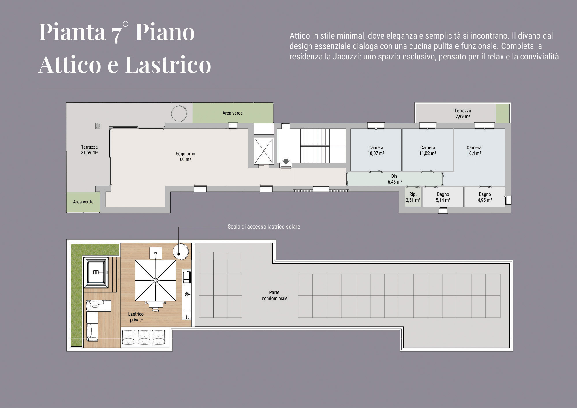 Completano la composizione l’ingresso, disimpegni comodi e un vano tecnico a servizio dell’unità.