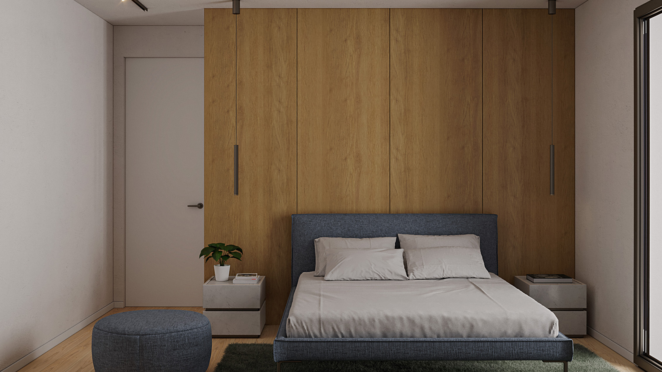 L’arredo è caratterizzato da elementi essenziali e contemporanei: divano modulare dalle linee morbide, poltrona scultorea e tavolino basso minimal nella zona living. La cucina è integrata con colonne in legno e isola centrale, affiancata da un tavolo da pranzo lineare con sedute imbottite. Il legno a tutta parete unifica gli ambienti, creando un insieme ordinato, elegante e coerente.