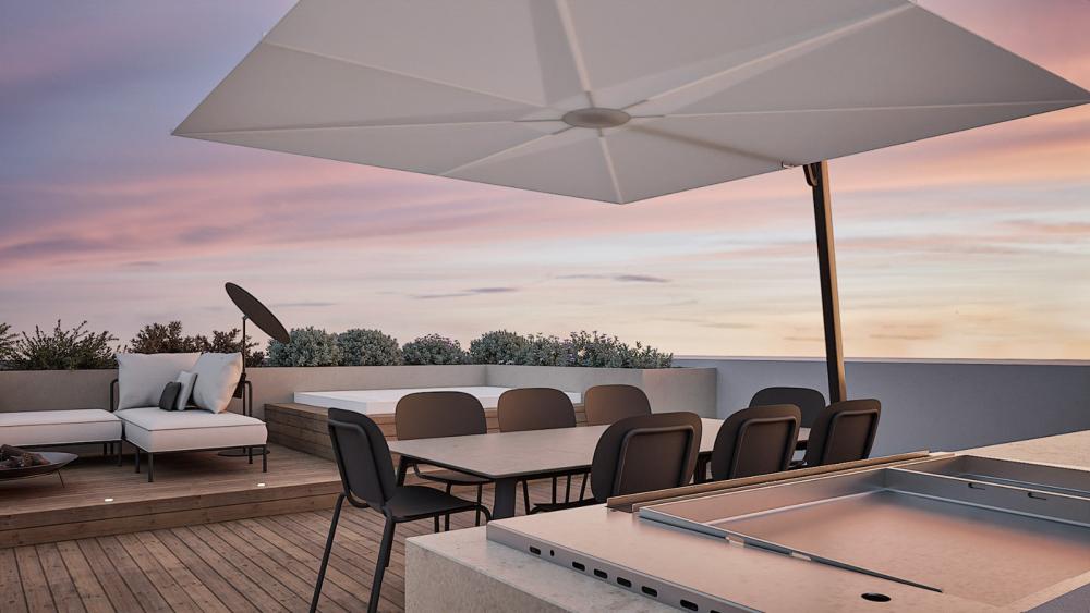 L’appartamento si sviluppa su un unico livello con ambienti ben distribuiti tra zona giorno e zona notte. Il soggiorno open-space si apre verso un’ampia terrazza, creando una continuità tra interno ed esterno. La zona notte, separata, ospita tre camere da letto e due bagni, garantendo privacy e funzionalità.